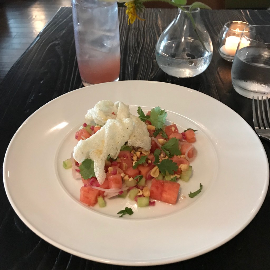 The red watermelon and cucumber salad with nam pla, peanuts, rice puffs, and Thai basil.