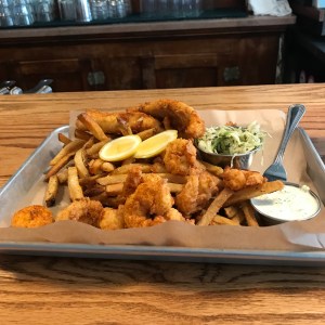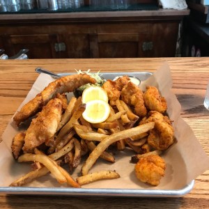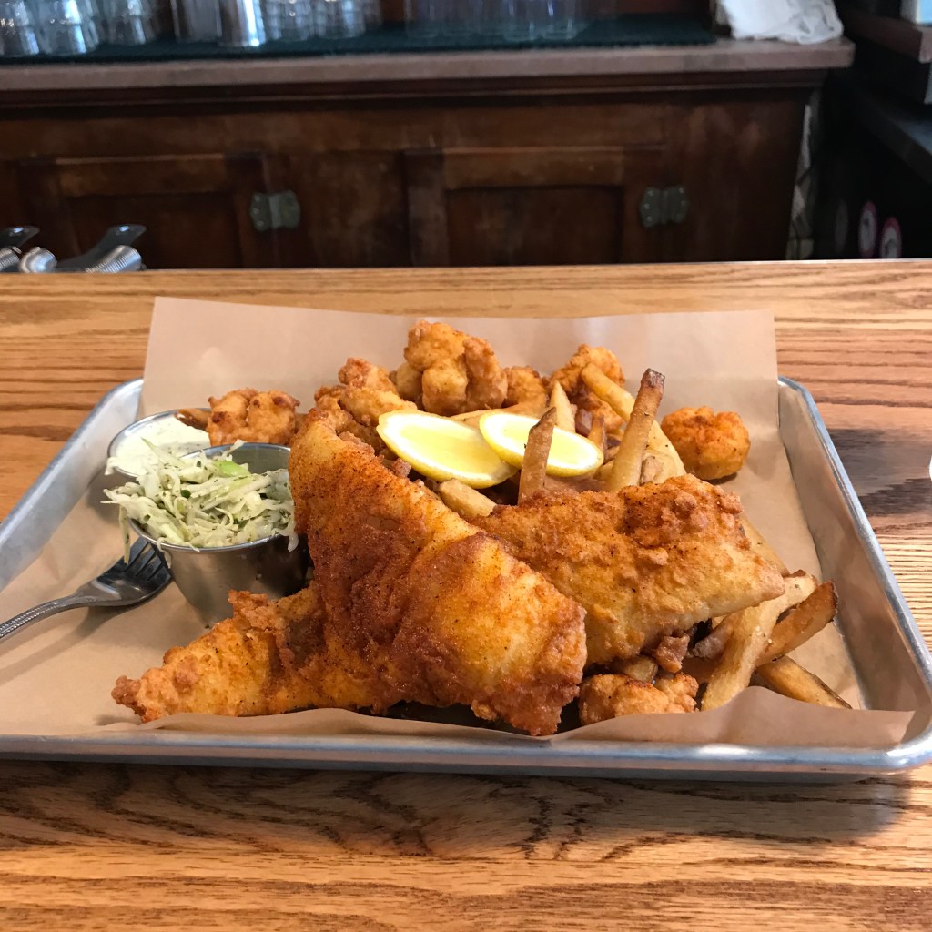 Three views [one above and two below] of The James Pharmacy bountiful Coastal Carolina seafood platter with flounder, shrimp, house slaw and an abundant supply of French fries.