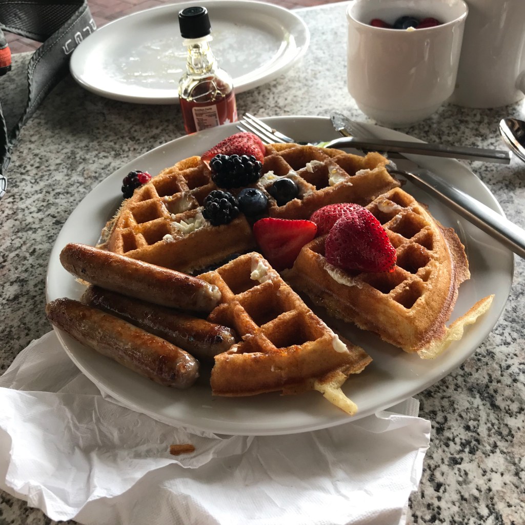 Grata’s waffles are made with a house made batter that creates a very crispy and light textured result. The single serve little moonshine jug of maple syrup goes very well with the waffle. I requested a cup of berries and Italian sausage links to finish off a simple, tasty mid morning breakfast. Very good house coffee too.