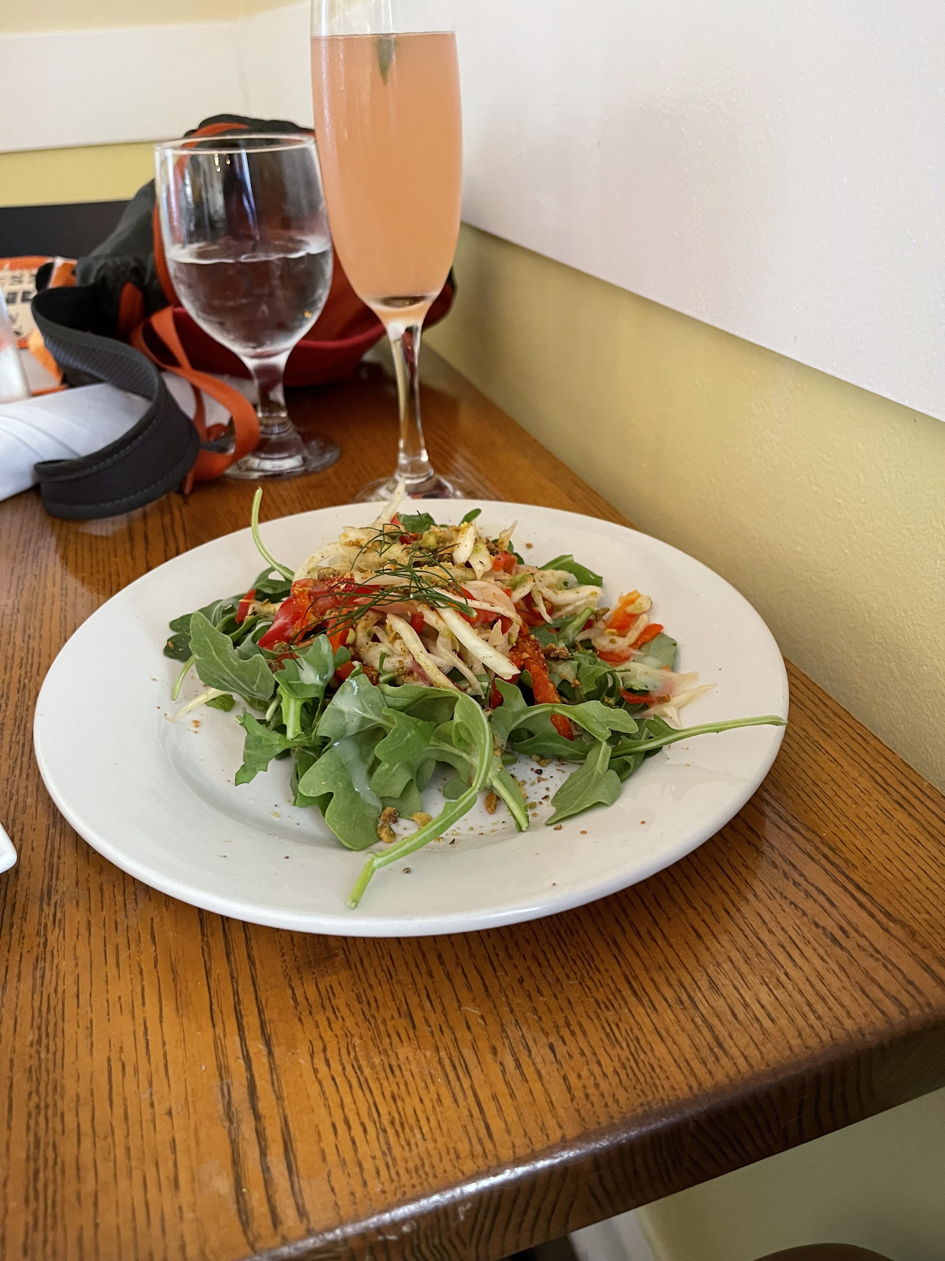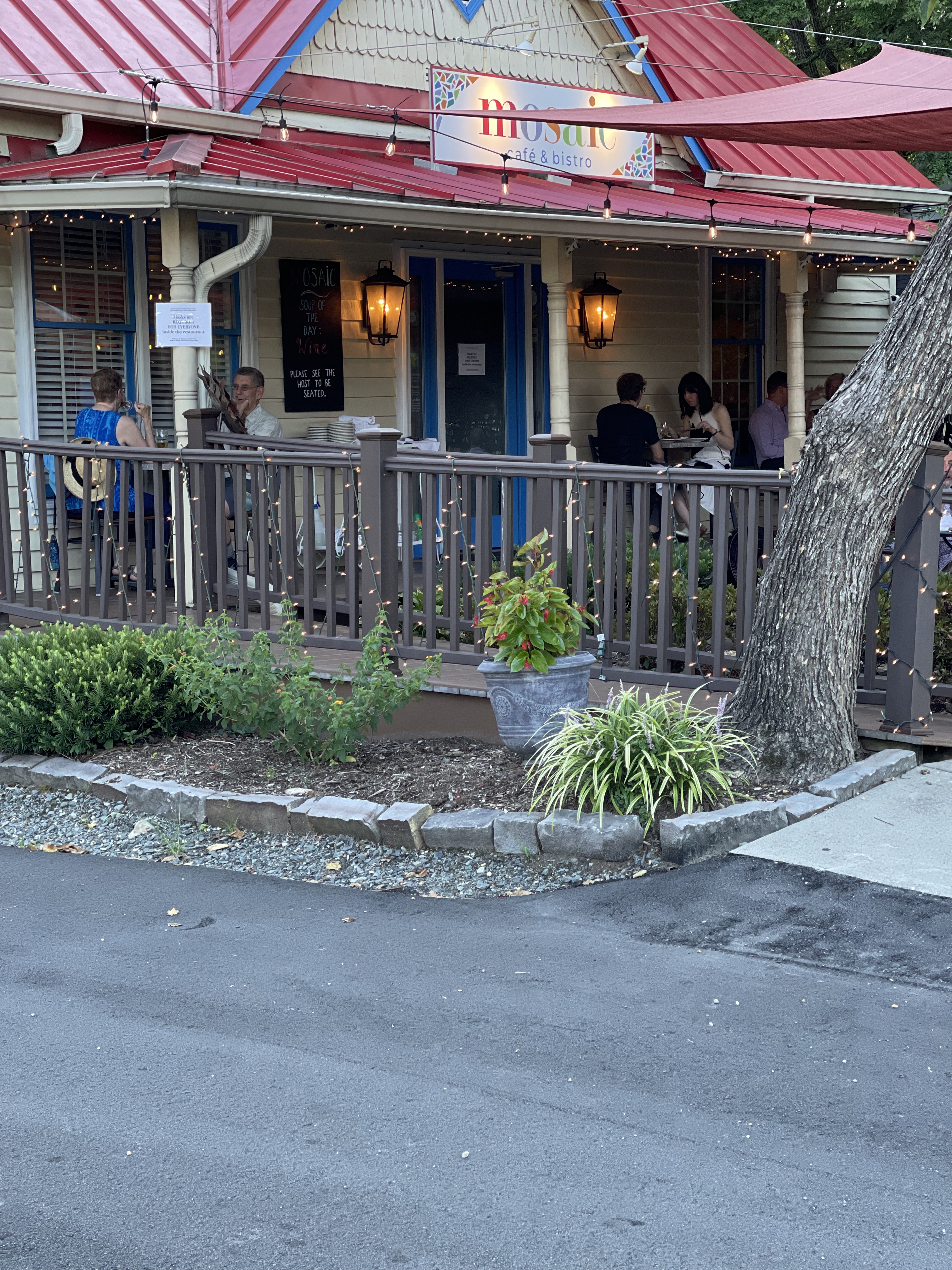Shrimp and avocado- garlic butter shrimp, avocado salad and house crostini. In the background house Hand-cut Fries.Fennel and pistachio salad — served on a bed of arugula with sweet peppers white balsamic and orange blossom essence..In the foreground a cappuccino. The cocktail is a Jack of Diamonds.The patio at MosaicThe patio at Mosaic