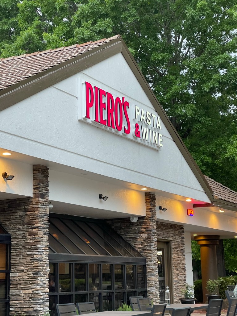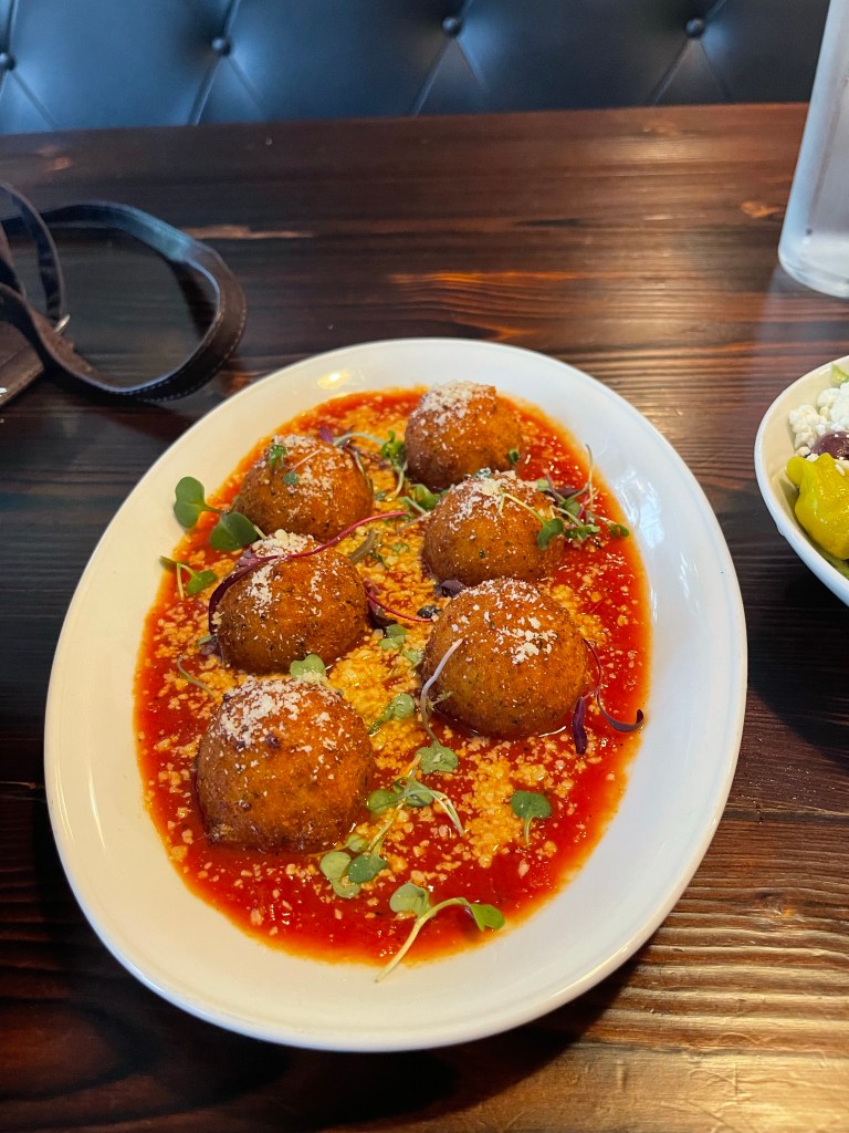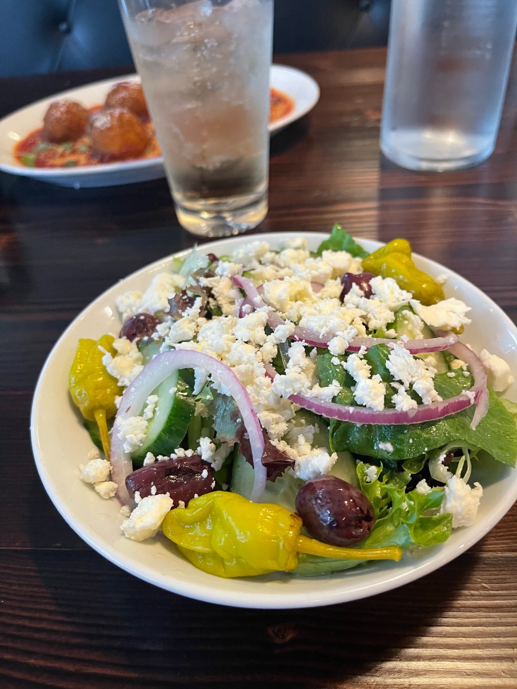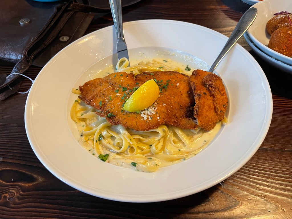 House baked bread with olive oilArancini Spaghettini Alfredo with light cream lemon sauce and chicken cutletThis is the Piero Salad—fresh, cool, and filled with wonderful ingredients like black olives. Pepperoncini peppers, mixed greens, red onions, and feta.