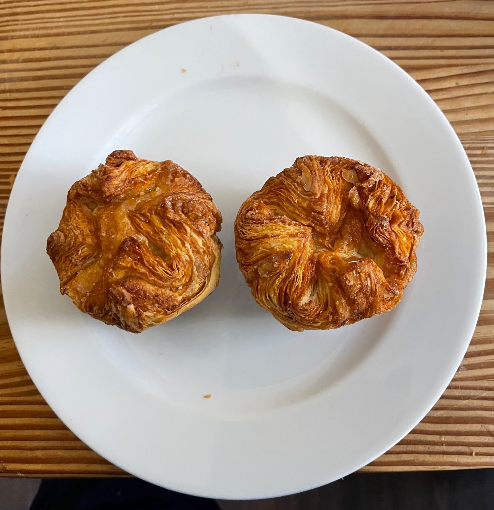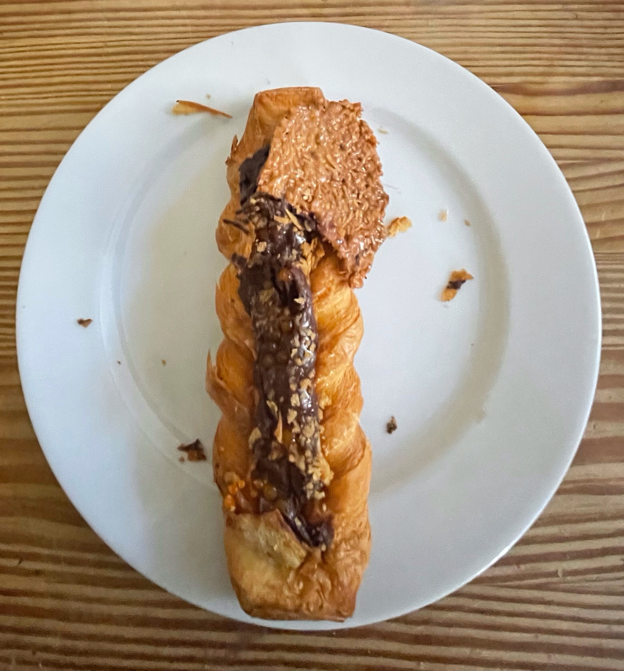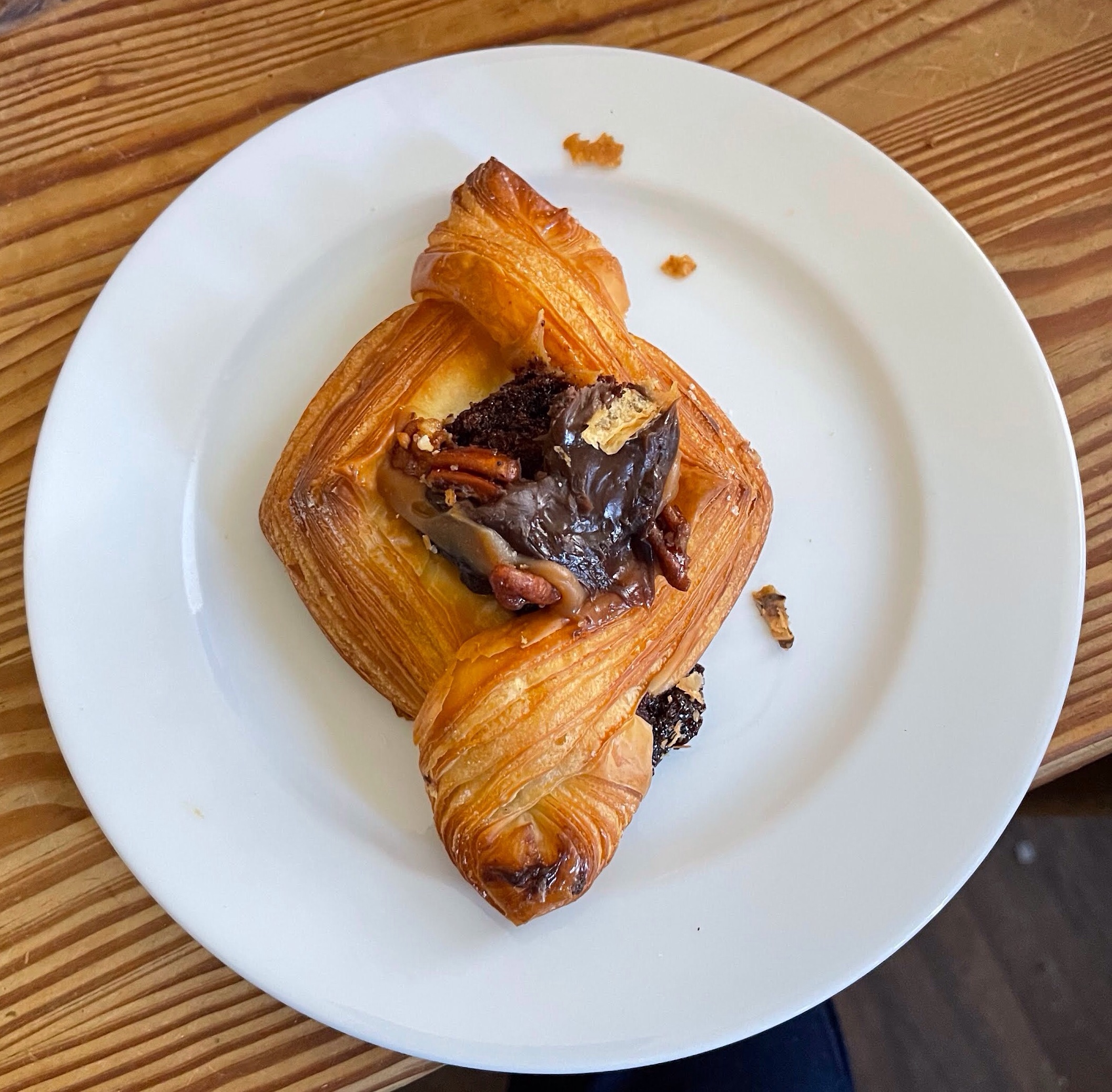 Two Turtledoves Danish — chocolate cake danish topped with creamy chocolate caramel and pecans.The Nutcracker- croissant twist topped with chocolate hazelnut mousse, hazelnut crumble and orange pearls.