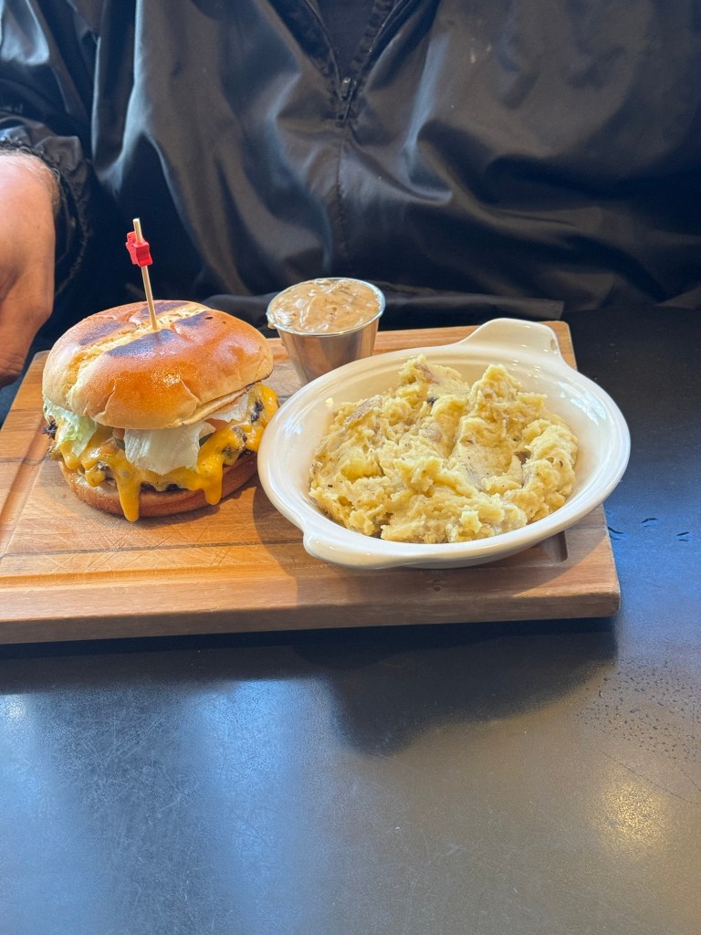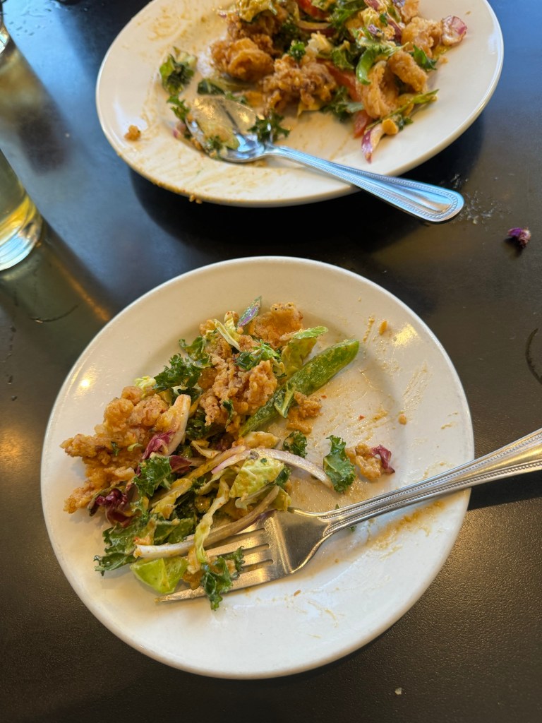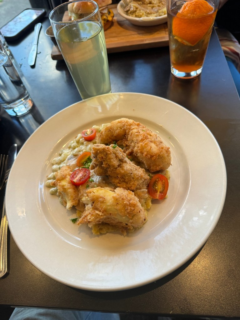 Pecan crusted fried chicken with butter beans and mashed potatoes.