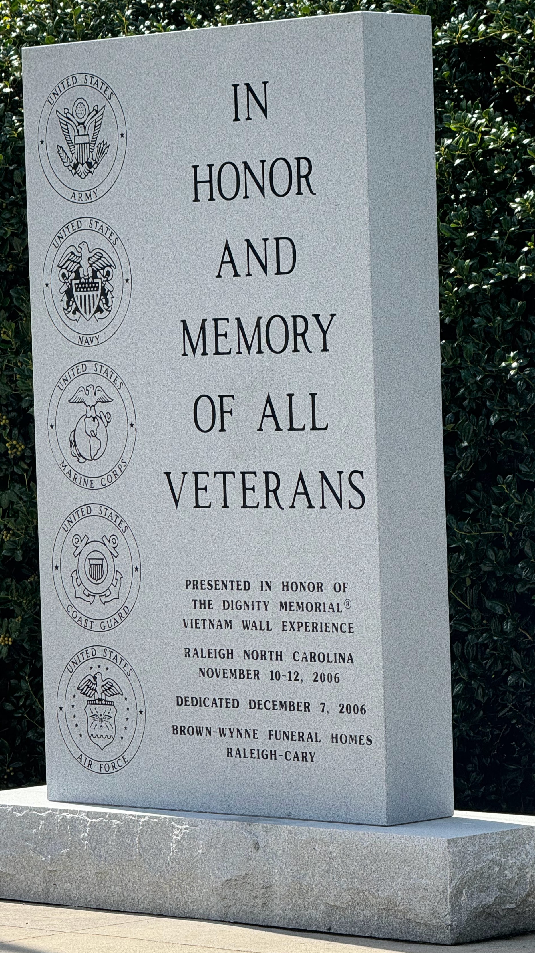The Veteran’s Memorial located in Cary, North Carolina