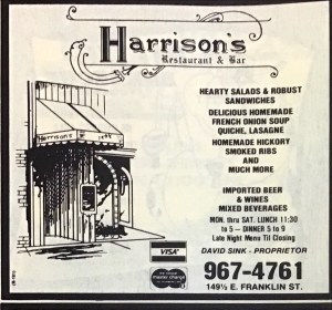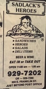 There we’re always good sandwich shops in and around Franklin Street. I can remember a Blimpie on Rosemary, Jersey Mike made huge sandwiches in the spot that’s now Buns on North Columbia, and at one point there were incredible sandwiches sold at a shop on the lower level of He’s Not … . My choice as best sandwich shops are three amazing places lost to us—Tripodi’s Deli, Sandwich and Sadlacks. Sadlack was situated where Linda’s Bar and Grill is now. There menu was filled with creative and appealing sandwiches. For a short period after their shop closed and they were replaced by Linda’s, they sold some of their sandwiches from the lunch counter at Sutton’s.