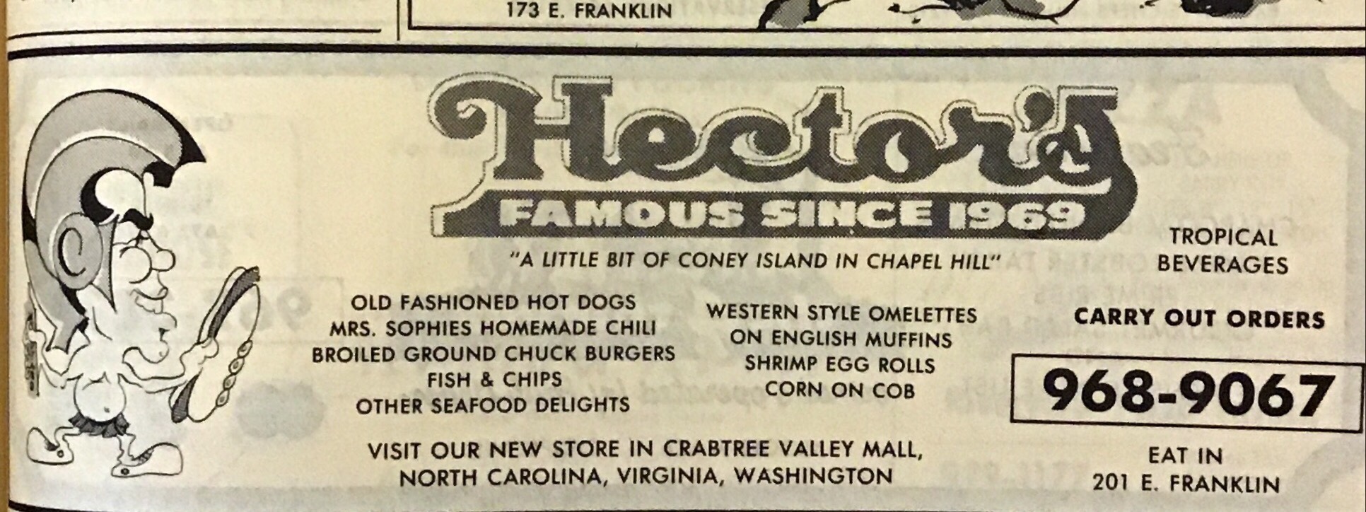 The food choices shown in the phone book ad above doesn’t list the Greek or Mediterranean options like souvlaki or gyros that I got as often as I got the burgers. There wasn’t much seating so I’d either take it home or dart across the street to eat on the stone wall on McCorkle or a park bench near the wall [the benches and trash receptacles were removed by the mid 80s]. The ad also notes other locations for Hector’s. As an undergrad and about every year afterward, I routinely made trips to DC. In 1978 I moved to DC and hung out in Georgetown a lot. That’s when I came across the district’s Hector’s on Wisconsin Avenue just above M Street. The Franklin Street Hector’s burned in a fire that essentially gutted the corner of the building it occupied in the mid 80s. It took several years for the owners of the space to repair and reopen the old Hector’s space. When it did reopen there was no Hector’s. For a brief period one of its occupants was a an Oyster bar/restaurant which actually had very good sea food. Various dance or private clubs have occupied the space since. Hector’s did have several temporary locations near by on both Rosemary and Henderson. It opened as a second time in its original corner building but on the second floor with pleasing views of McCorkle Place and Franklin.