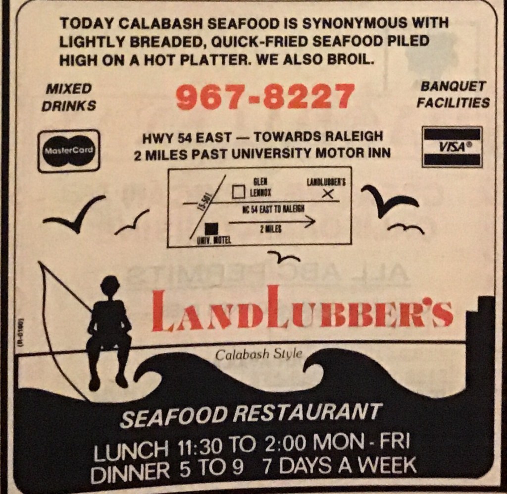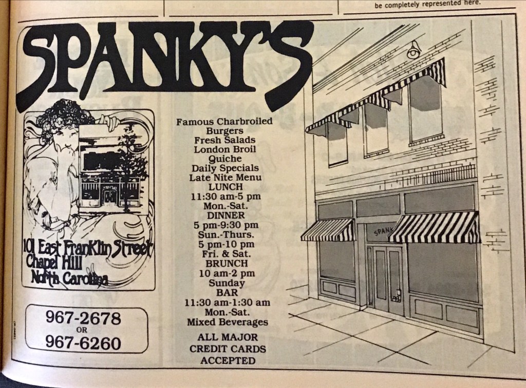 When I returned to school in 1972. I found that the dining scenery has changed significantly and discovered how different Chapel Hill’s dining scene was. Below are places my friends and I happily explored when we weren’t entertaining one another. Here’s to our happy days David and Linda, Bob and Laurie Scott and Nancy, Charles Harrison, and Mark Bateman