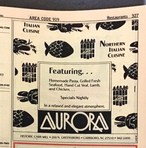 Aurora was one of my all time favorite restaurants in the area. It’s location ‘genealogy’ is interesting too. The original restaurant was located on West Franklin in the space that became Elaine’s according to a longtime waiter on my last visit there. Then it relocated to Carr Mill Mall in Carrboro. The Mill location was a beautifully designed spot on the Greensboro Street side of the building. The dining area was a roomy space in segments set off by its soft golden lighting a kind of stylized grotto effect. The bar and waiting area had natural lighting from the windows on the building’s north side. But Aurora was always about the wonderful Northern Italian food. I didn’t dare make eating there routine, I’d only go there when friends came to town or on special occasions. At some point in the early 90s the restaurant relocated to its last location, in the old home of another iconic local restaurant Slugs at the Pines near Finley Golf course where it slowly faded away. The Carr Mill has had two very nice replacements. First was Panzanella which was followed by Tandem.