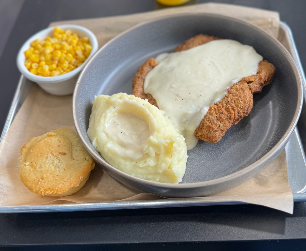 The catfish plate is mashed potatoes, slaw, and cornbread